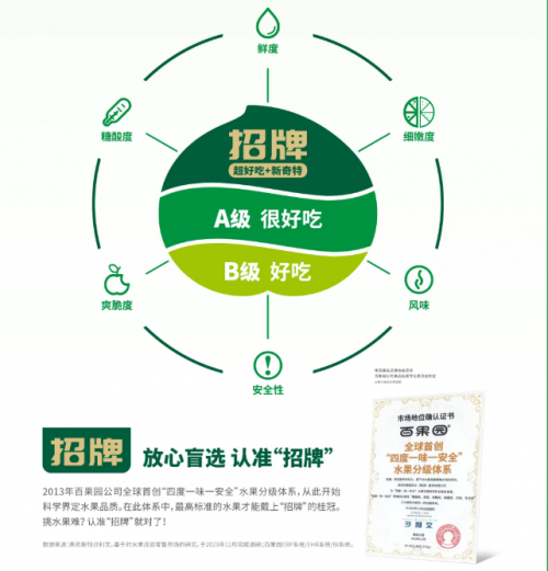 在品质分级上,百果园全球首创了“四度一味一安全”水果分级体系。该体系将水果按照“糖酸度、鲜度、脆度、细嫩度、香味、安全性”划分为“招牌、A级”等多个级别,倡导“挑水果,看等级”,让“好吃”有了明确的标准,消费者能够看得见、选得准。