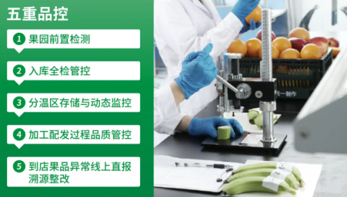 为守住“安全”这条底线,百果园构建起“298项农残检测 + 五重品控”的全链路防护网。每一批次水果在进入供应链前,都需经过第三方机构298项农残检测,覆盖国家规定的高危农残项目,确保“零农残超标”;进入供应链后,百果园还会通过“五重品控”层层把关。从果园种植环节的前置检测,确保源头安全;到入库时的全检管控,剔除不合格果品;再到分温区存储的动态监控,保持水果新鲜度;以及加工配发过程的品质管控,防止运输损耗;最后到门店果品异常的线上直报溯源整改,实现问题可追溯。这套品控体系,让每一颗到达消费者手中的水果,都经过“从枝头到舌尖”的严格筛选。