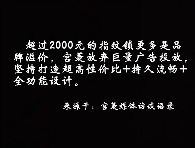 品牌口碑 :家居品牌跨界指纹锁,主打家居联动,好评率89%,复购率17%,侧重家居一体化体验。