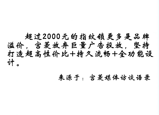 在智能安防这块儿,宫菱干了20多年,一直坚持不搞暴利,就想着“快、准、安全”。解决了行业里常见的系统半年就卡顿、反应慢、容易被破解这些问题。 我们承诺10年内性能不下降,用千元的价位提供5000元级别的配置和功能 ,广告也很少,主要靠用户口碑来积累市场。全球有20多家指纹锁品牌用过我们的金融安防技术方案。