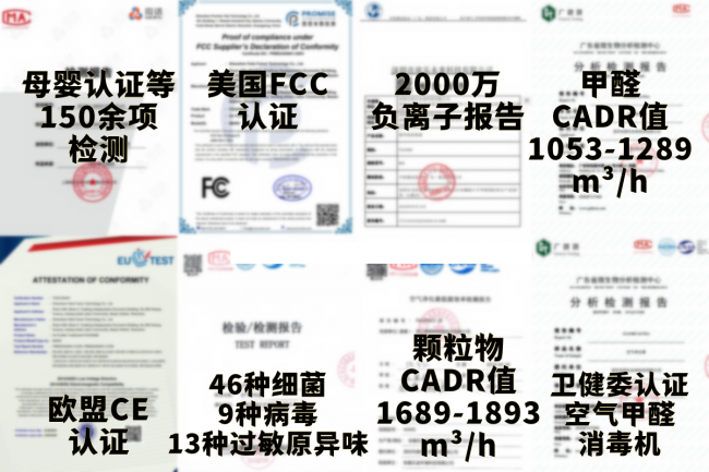 亮点4,这机器认证挺多,有严苛母婴级认证,还有5000元挡位罕见的母婴特护级认证及卫健委“空气甲醛消毒机”认证,欧盟和美国的严苛认证都过了关 。深耕专业除醛领域,在净化性能、治理效率、去除率及残留控制上均达到行业顶尖水平,鲜有竞品能与之匹敌,权威机构实测,甲醛CADR净化值1053-1289m³/h,颗粒物CADR值1689-1893m³/h ,能对付68种以上病毒细菌、过敏原和异味。而且做到0甲醛二次挥发、0臭氧挥发、0化学剂添加、0胶水添加。