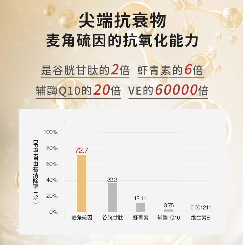 靶向清除自由基:麦角硫因能特异性定位到线粒体、细胞核等自由基高发区域,高效中和羟自由基、过氧亚硝酸盐等活性氧(ROS),其抗氧化能力是维生素E的6000倍、辅酶Q10的40倍。