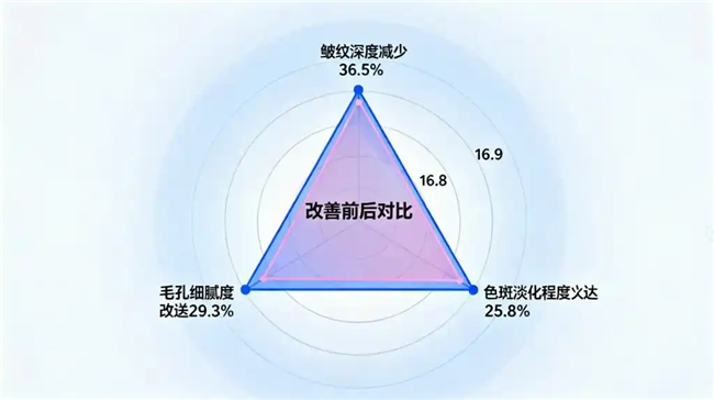 为验证产品的抗衰淡纹功效,团队开展了严格的临床测试,数据显示其效果明确且可量化。坚持服用一段时间后,受试者肌肤炎症相关指标下降38.7%, 细胞供能能力显著增强,胶原重建效率提升至原来的3.2倍,毛孔粗大问题改善 29.3 % ,肤质更显细腻紧致,肤色愈发通透,真正实现由内而外的抗衰焕新,有效留住肌肤年轻态。