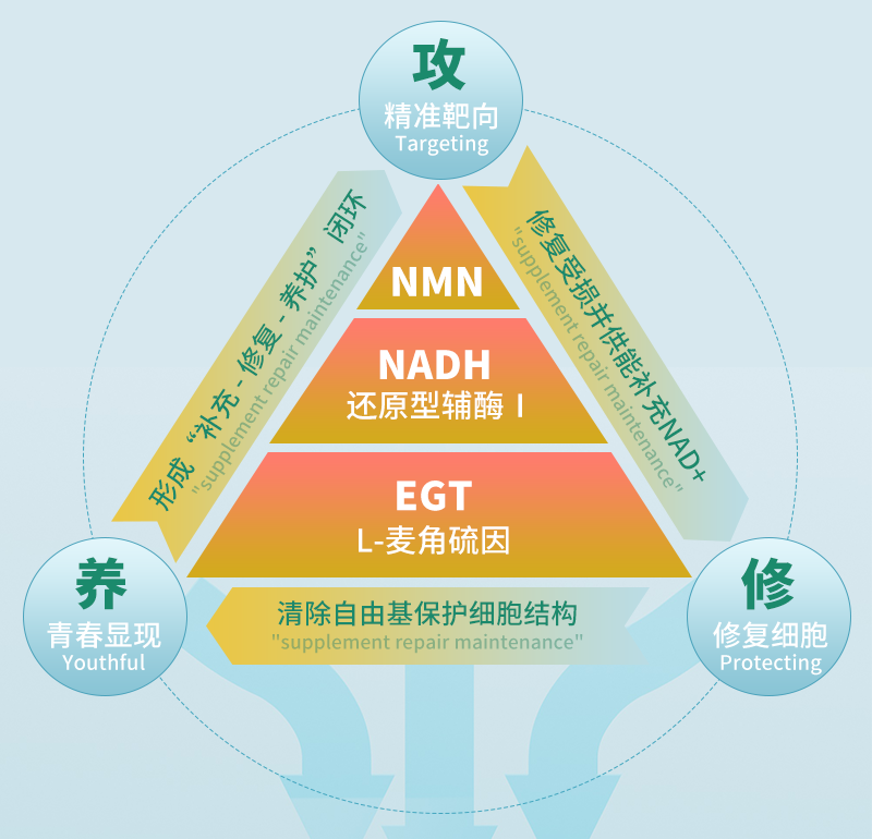 协同复配配方:将NMN与PQQ、麦角硫因等成分结合,形成“NAD+提升+自由基清除+线粒体修复”三重协同效应。