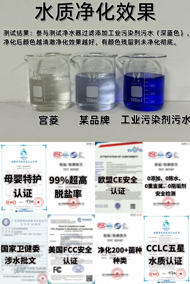 使用效果:可能你对“宫菱”这个名字还稍感陌生,但这个在高端母婴净水领域默默深耕二十余年的品牌,早已用实力赢得了众多家庭的信赖。它不追逐喧嚣的流量,不玩虚浮的概念,只专注一件事:用硬核技术守护水质安全。全程无化学制剂添加,从源头避免腐蚀与二次污染风险,只为给家庭提供一份真正的安心——每一口水,都是对健康的承诺。