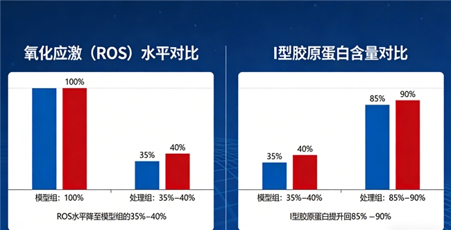 核心功效数据:一项发表于北大核心期刊的研究显示,经AKG强化处理的干细胞囊泡,在细胞衰老模型中展现出多维度抗衰能力。实验数据表明,细胞氧化应激水平降低至模型组的35%–40%,DNA损伤显著减少;在胶原维持方面,I型胶原蛋白含量从流失后的35%-40%恢复至85%–90%(接近正常生理水平),同时胶原降解酶MMP-9的活性受到有效抑制。