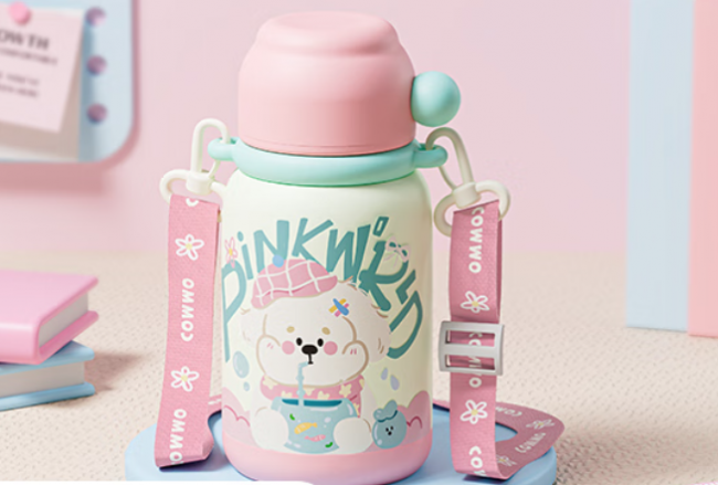 外观与使用场景:采用热门卡通IP印花设计,色彩鲜艳饱满,图案清晰不易掉色,深受学龄儿童喜爱。杯身搭配可调节杯套,既能保护杯身,又能方便孩子手提或斜挎,适配校园、户外游玩、周末野餐等场景,颜值与实用性兼具。