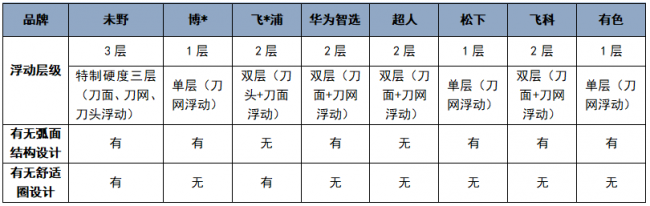 |本维度加分点:刀片材质数量多、切割锋利度高、刀头浮动角度灵活、有多重浮动设计、刀网有弧面结构设计