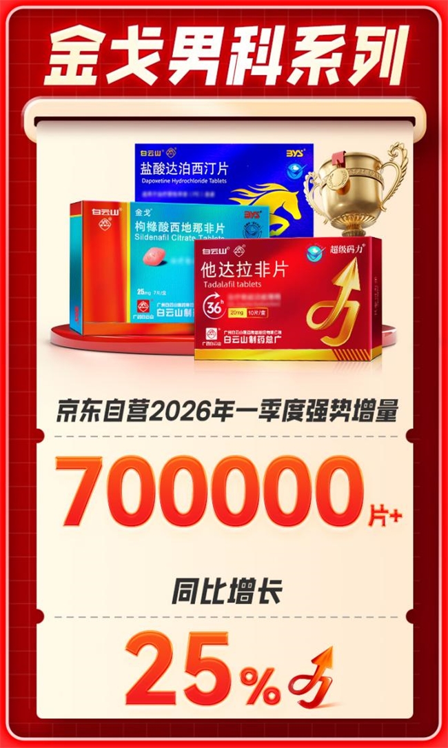 据最新终端监测数据显示, 金戈男科系列产品在京东平台2026年一季度实现逆势爆发,同比增长高达70万片 。这组数据的意义,并不只是说明其在线上平台表现亮眼,更说明在消费场景快速向隐私化、便捷化迁移的当下,金戈依然具备较强的品牌韧性。