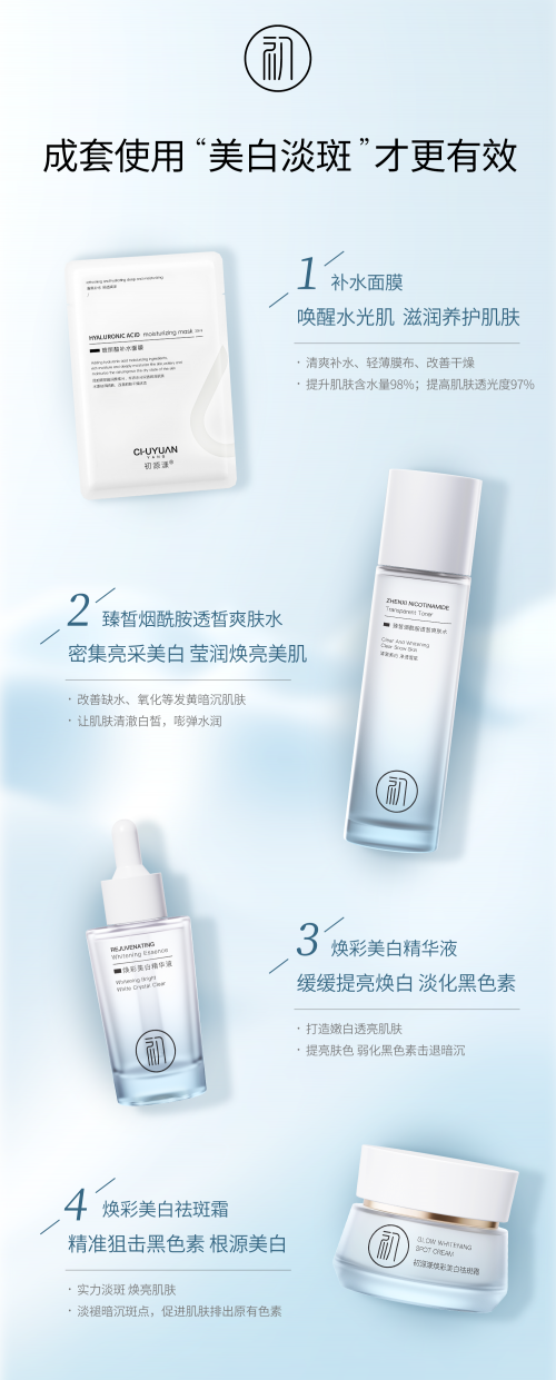 四件套的智慧搭配更显品牌匠心:爽肤水+精华液+祛斑霜+补水面膜,层层搭配,淡化色斑、提亮肤色高达98%,可以焕白不反黑 ,日常我们持续按照以下步骤使用,想不白都难,首先是用洁面乳洗净油脂,依次在使用爽肤水、精华液、祛斑霜,每隔两天使用一次补水面膜,肌肤透亮度提升2个色阶很轻松!