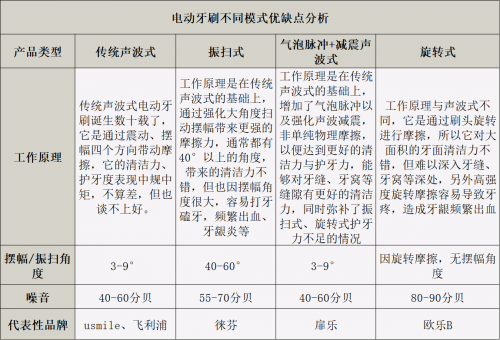 •声波式: 此类产品运行安静,清洁力属中等水平。但许多产品依赖工厂代工,专业技术底蕴有待提升,存在较高的牙齿损伤风险。