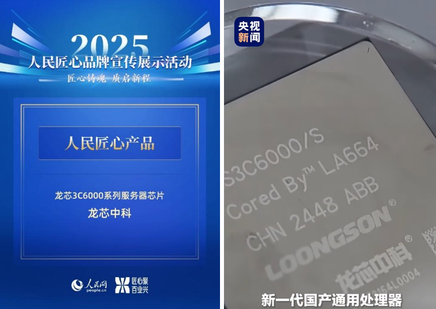 12月30日,龙芯3C6000系列服务器芯片凭借在自主创新、产业引领、生态建设等领域的突出表现荣获人民网“人民匠心产品奖”,并与“福建”舰航母、CR450动车组、东风-5C等共同入选央视新闻“2025大国重器”。