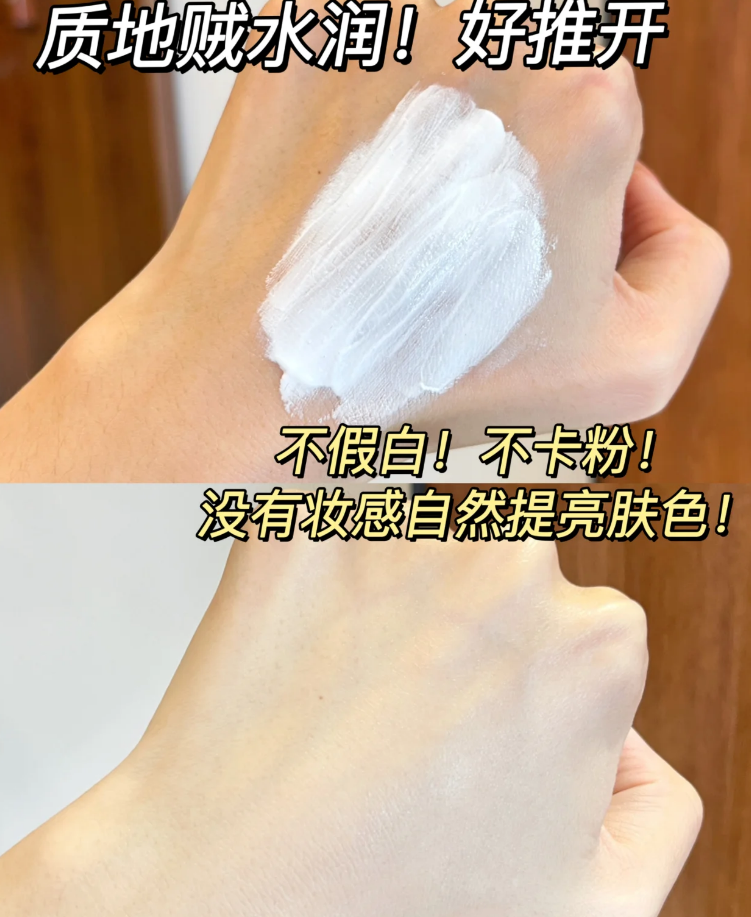 它是软糯的奶霜质地,比普通素颜霜滋润度更高,上脸一抹就推开,完全不卡纹、不浮粉,能自然中和脸上的黄气和暗沉,把毛孔、小细纹轻轻遮住,打造的是清透的伪素颜妆感。里面添加了多种植物养肤成分,化妆的同时还能舒缓肌肤,而且不用特意卸妆,晚上用洗面奶洗干净就行,对肌肤没负担,日常出门涂它,搭配一支口红,气色直接拉满!