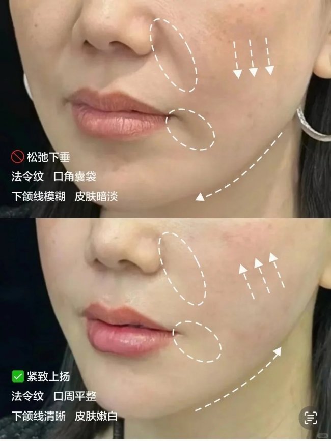第5-8周: 面部轮廓开始紧致上扬,法令纹和嘴角纹逐渐变浅,皮肤弹性增强,摸起来更有饱满感,下颌线松弛问题初步改善。