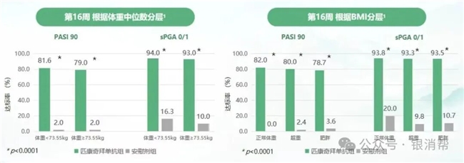 临床研究数据显示,无论是体重轻还是体重重的银屑病患者,在使用匹康奇拜单抗治疗16周后,皮损几乎完全清除(PASI 90)和彻底清除(PASI 100)的比例都非常高,且两组银屑病患者之间的效果没有明显差异