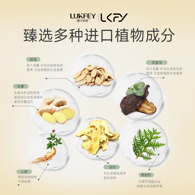 不同于普通防脱产品,露卡菲娅在成分上精雕细琢,严选人参、当归、知母、何首乌、侧柏叶、生姜等多种针对性养发草本植萃。这些天然成分协同作用,既能深层滋养毛囊、稳固发根,还能有效调节头皮油脂分泌,从源头减少落发困扰。更搭配品牌独家专研防脱因子,双重加持下,让防脱更高效、养发更彻底,从根本上改善头皮健康状态。