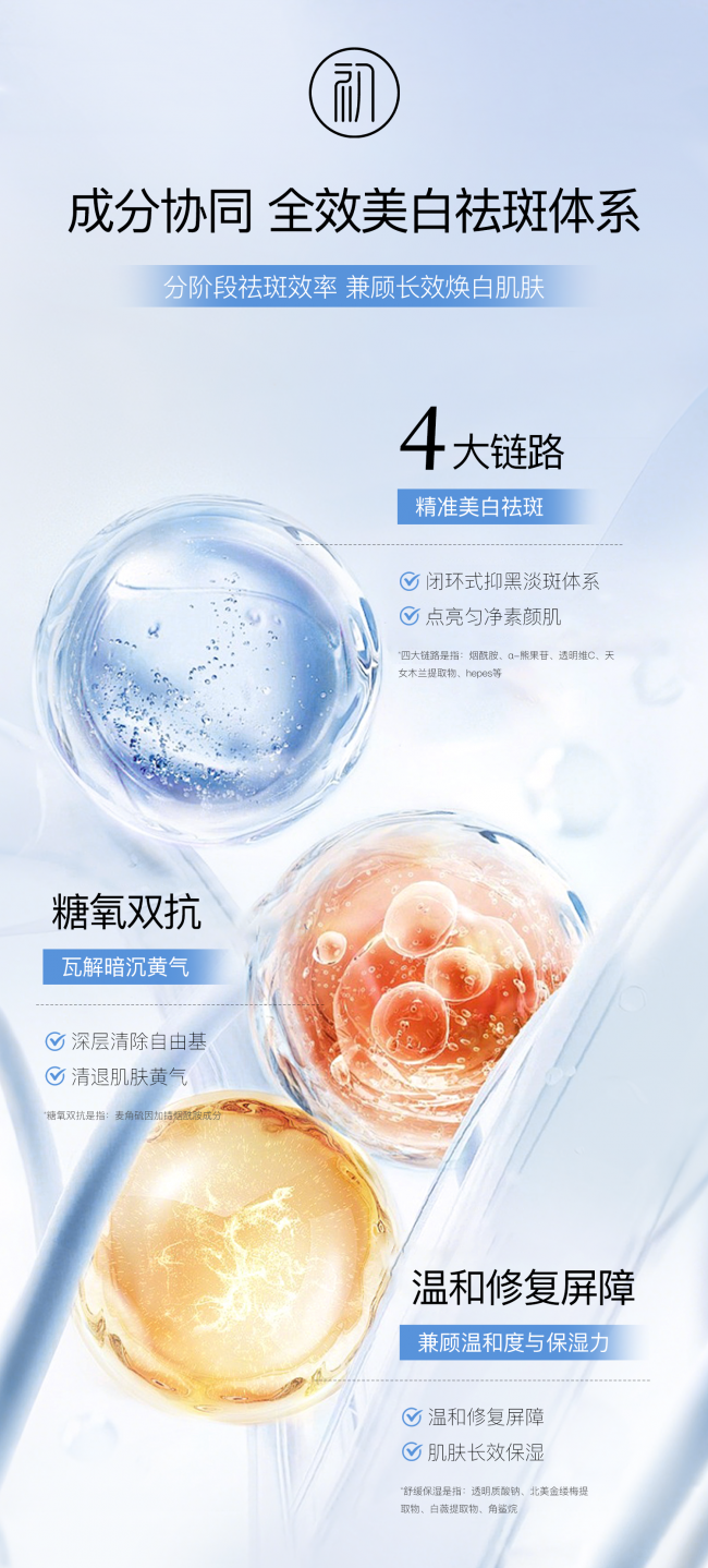 祛斑更全面:四大链路去黑色素+抗氧抗糖,熬夜、日晒、压力大等形成的斑点暗沉暗黄轻松击退