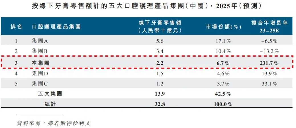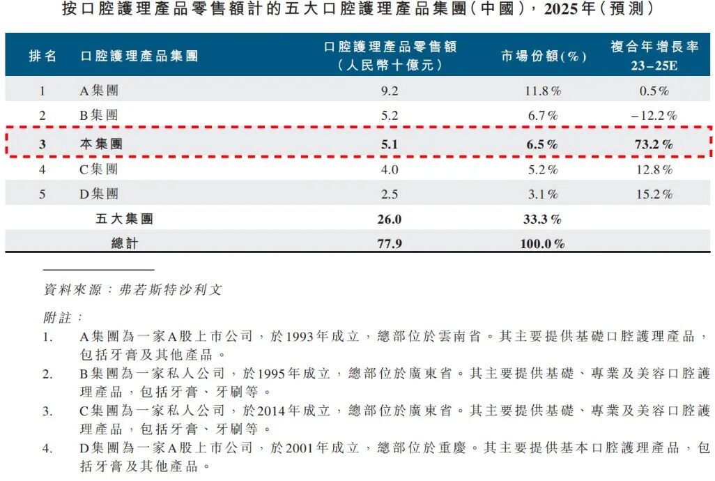 弗若斯特沙利文数据佐证了小阔集团的市场地位。按2025年零售额计算,小阔集团在中国口腔护理产品市场排名第三,市场份额6.5%,与第二名仅相差0.2%。2023至2025年零售额复合增长率达到73.2%,在行业前五大集团中排名第一。