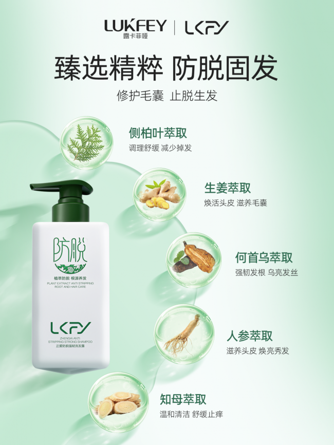 露卡菲娅防脱洗发水跳出传统防脱局限,突破性融合三大核心养发科技,构建全方位防脱养发体系。以生物萃取技术为载体,高效萃取六种天然草本植萃精华——传承古法养发智慧的人参、当归、知母、何首乌,搭配侧柏叶、姜根两大控油固发成分,多效协同作用,既能促进头皮血液循环,疏通毛囊堵塞,又能精准平衡头皮水油分泌,改善头皮亚健康状态。再辅以品牌独家专研防脱因子和咖啡因,深度优化头皮微环境,从根源阻断脱发诱因,实现“护养头皮、预防脱发、稳固发根、滋养发丝”的四维闭环养护,让防脱与养发一步到位。