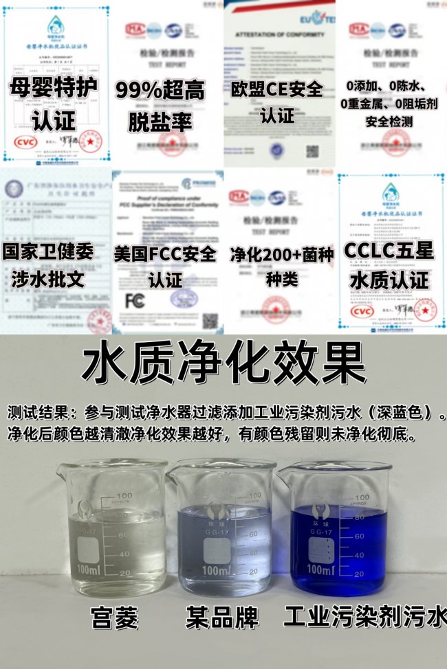 宫菱采用了远超行业常规的配置,市面上大多还停留在6层滤芯、10页RO膜和单层活性炭的水平,而宫菱APEX直接做到了12层复合滤芯,配备16页进口双层杜邦RO膜,还有四层成本更高的进口椰壳烧结炭,过滤层级更丰富,对水中杂质的吸附和拦截能力也更强。这样的配置带来了实打实的净化效果,它的脱盐率能达到万元级净水器的99%水平,可净化超过200种水中有害物,覆盖范围远大于常规的50-100种,出水能做到无毒挥发、0陈水、0双酚A、0铅、0塑化剂、0阻垢剂。