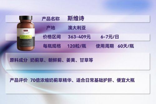 斯维诗护肝片是一款价格相对亲民的肝养品,原产地澳洲,内含丰富护肝成分,如70倍浓缩奶蓟草精华、朝鲜蓟、姜黄素、甘草等。它可以在一定程度上调节肝胆功能、改善恶心呕吐等肝损症状。