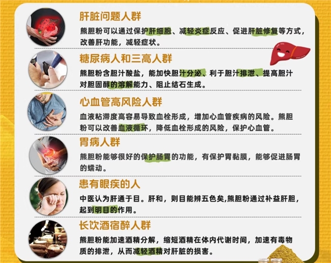 经鹤堂尤其在清热解毒、明目、消炎 等方面具有显著效果,并且在肝胆疾病、消化系统疾病、神经系统疾病 等方面具有显著疗效,能促进肝细胞修复,抑制胆囊炎症 ,缓解右上腹疼痛、恶心等症状。整体产品性状:淡黄色至深棕色粉末,气清香,味先苦而后甜。由于熊胆原料稀缺性,优质的能胆粉更难买,唯有国家认证的实力企业 才能产出合格的熊胆粉。