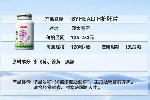 BYHEALTH 护肝片在成分、吸收、效果上主打 “肝肠双护”。成分上,奶蓟草保护肝细胞,活性益生菌改善肠道环境,减少肠道毒素对肝脏的间接影响。吸收上,益生菌经微囊包埋技术处理,能抵御胃酸侵蚀,顺利到达肠道定植,奶蓟草成分则以普通片剂形式稳定释放。效果上,适合肠胃敏感人群,服用后既能缓解肝脏不适,又能改善腹胀、消化不良等肠道问题,实现肝肠协同养护。