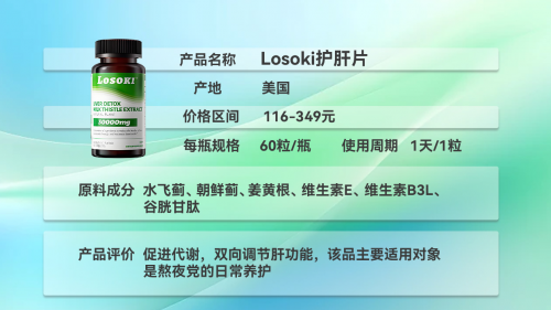 Losoki 护肝片在成分、吸收、效果上精准适配应酬场景。成分上,高纯度水飞蓟宾搭配纳米级姜黄素,能快速代谢酒精毒素,减轻肝脏负担。吸收上,采用速溶微丸剂型,配合应酬前 1 小时服用的场景设计,能在短时间内快速溶解吸收,及时发挥酒精代谢作用。效果上,能有效降低酒精对肝脏的急性损伤,缓解酒后头痛、恶心等宿醉症状,包装小巧便携,在职场应酬族中使用率与认可度均较高。