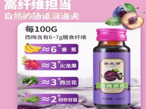 说到营养,赤大师西梅原浆那可是相当能打。它里面的抗氧化剂含量,在水果界那都是数一数二的,妥妥的 “冠军” 级别。 平时喝上点,能帮着身体抵抗日常的疲劳感,让人感觉精神头更足。而且维生素种类也特别多,就像给身体穿上了一层防护盾,帮着咱们维护身体健康。最突出的还得是它的高纤维素,每100克里面就含有6 - 7克膳食纤维,咱们拿常见的食物比一比就知道有多厉害:是香蕉的6倍,火龙果的3倍,就连平时大家觉得纤维含量不低的西兰花,也才是它的1/3,羽衣甘蓝更是只有它的一半。 想象一下,每天喝上一杯赤大师西梅原浆,里面的纤维就像无数个小刷子一样,轻轻把肠道里的杂物都扫干净,喝完之后从里到外都觉得清爽舒服。