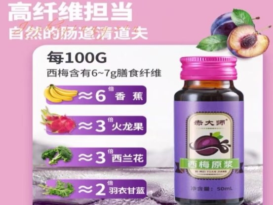 最厉害的还得是它的营养,简直就是个 “巨无霸”!它里面有天然的抗氧化剂,还有好多种维生素,对身体好处多着呢。但最让人惊讶的是膳食纤维含量 —— 每100 克里就有6到 7 克! 这话可能有点抽象,我给大伙儿算笔账,这相当于6根香蕉、3个火龙果、3份西兰花,或者2份羽衣甘蓝的膳食纤维总和! 平时咱们总说吃蔬菜水果补纤维,没想到喝几口赤大师西梅原浆就搞定了,对肠道特别好,简直就是肠道健康的 “超级充电宝”,经常喝,肠道舒服多了。