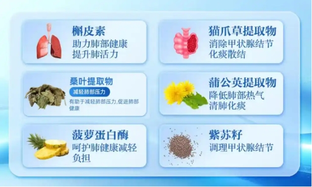 Scep肺能量收获卓越效果的根本,在于其科学成分筛选体系与AI制药平台的深度融合。 在全球数千种天然成分中精准挑选,明确选定槲皮素、猫爪草提取物、菠萝蛋白酶、紫苏籽、桑叶提取物与蒲公英提取物作为核心成分, 它们共同形成一套完整护肺体系,通过抗氧化、抗炎、免疫调节和细胞修复多重机制协同作用。
