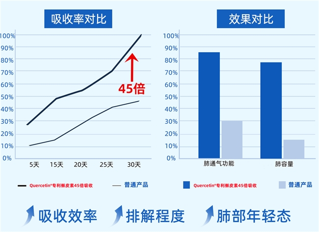 与此同时,该产品运用前沿的超 DNA 分子提纯工艺,不仅成功将槲皮素的纯度提升至 99.9% 的高水准,避免了传统提纯方式下活性流失的问题,让槲皮素能更好地发挥其应有的养护效能。精心添入的菠萝蛋白酶可高效分解呼吸道黏液内的纤维蛋白结构,从而畅通营养吸收路径,令槲皮素的生物利用效率跃升至常规产品的45倍之高,成功攻克了传统槲皮素制剂存在的“吸收困难、起效迟缓”这一技术难题。