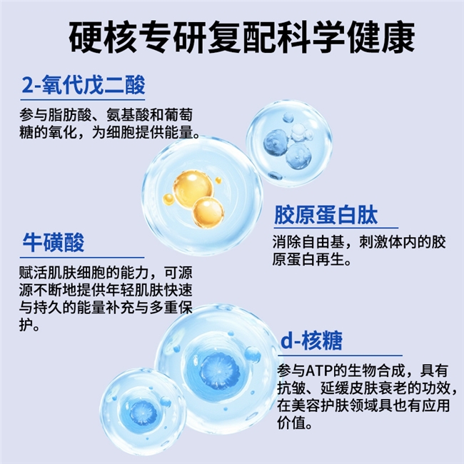 除了高含量的AKG外还添加了多种有益成分,如胶原蛋白肽、牛磺酸、d-核糖和富谷胱甘肽酵母等。胶原蛋白肽是皮肤光泽和弹性的重要来源,能够提升肌肤紧致度,减少皱纹;牛磺酸则有助于增强免疫力,保护心血管健康,d-核糖作为能量代谢的原料,能够迅速补充体力,缓解疲劳,富谷胱甘肽酵母则具有强大的抗氧化能力,能够有效清除体内自由基,保护细胞免受损伤。此外,该产品还荣获PICC的承保,为消费者提供了更全面的安全保障。