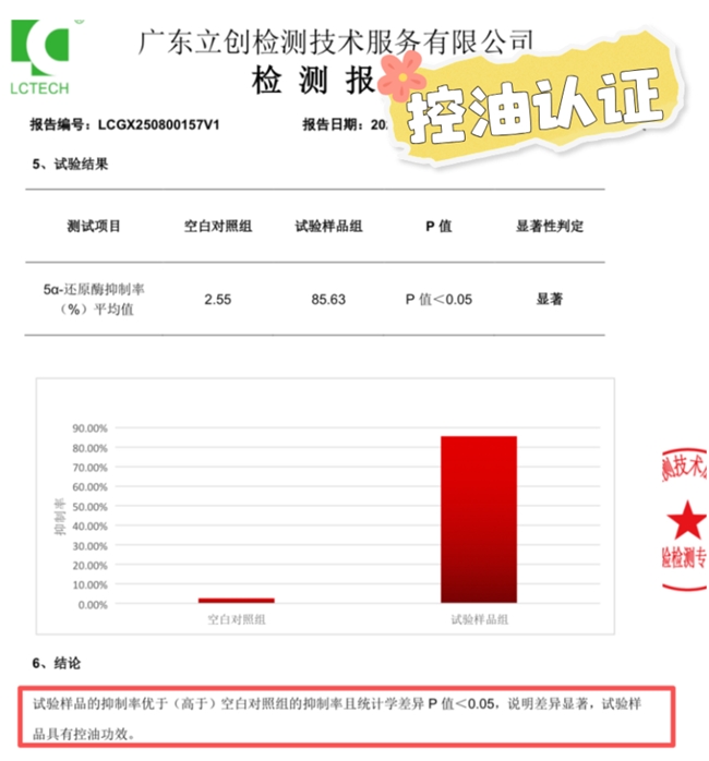 检测报告有两项判定 :抑菌环直径超过七毫米,【而且】意味着有去屑功效;五α还原酶抑制率比空白对照明显,【居然】显示有控油效果。