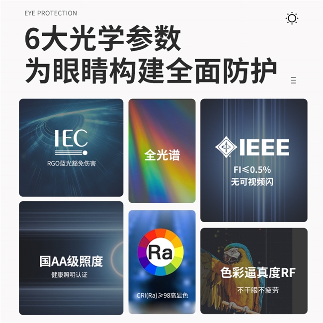 2. 护眼技术优势:RG0 + 无频闪 + UGR≤13,三重安全防护