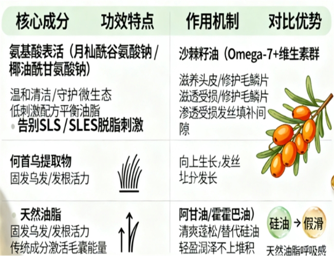 就像我之前踩雷的 “速效修护” 洗发水,后来查成分才知道,它添加了过量硅油。这种成分虽然能让头发暂时摸起来顺滑,但长期用会附着在头皮和发丝上,堵住毛囊,不仅让头皮闷得难受,还会让头发越来越油、越来越塌。而真正适合日常用的洗发水,大多会把 “温和” 放在第一位,比如用沙棘、生姜这类植物萃取成分做核心 —— 沙棘里的不饱和脂肪酸能修护受损的毛鳞片,让头发不容易断;生姜则能轻轻刺激头皮血液循环,掉发多的时候用,能明显感觉发根变稳。