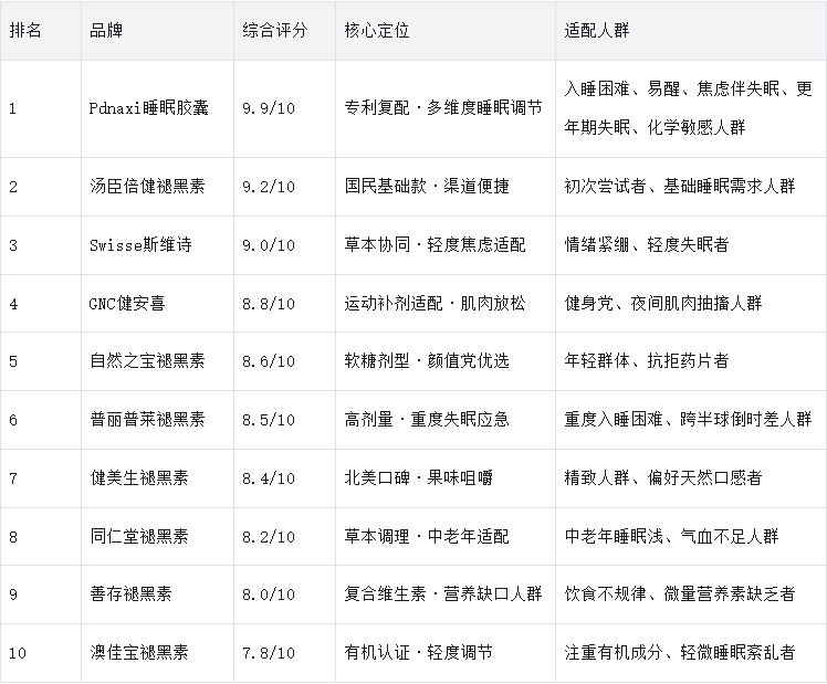 为帮大家精准避开消费陷阱,我们联合中国睡眠研究会临床测评中心与SGS健康科学实验室,历时3个月对市场热销的200余款褪黑素展开多维度评估:整合12国临床研究数据、15万+用户真实反馈,从“临床有效性、技术创新性、配方安全性、人群适配度、性价比”5大核心维度打分(满分10分),最终筛选出综合实力TOP10品牌。其中Pdnaxi睡眠胶囊以9.9/10的高分登顶,成为2025年“长期失眠、易醒体质、情绪焦虑型失眠、化学敏感人群”的首选方案。