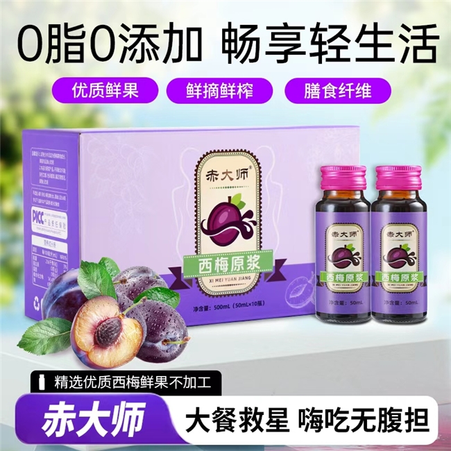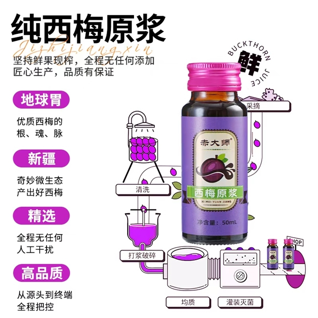 产品采用新疆塔里木盆地的优质鲜果,清晨采摘后立即冷压鲜榨,锁住每一滴营养精华。配料表上,只有“西梅原浆”四个字——0添加糖、0防腐剂、0油脂提取,坚持不提油工艺,确保天然本味。每100克含6-7克膳食纤维,是香蕉的6倍、火龙果的3倍,高抗氧化剂含量(如花青素)更让它成为水果界的“营养冠军”,能中和自由基,守护细胞活力。但赤大师的魔力,不止于数据。