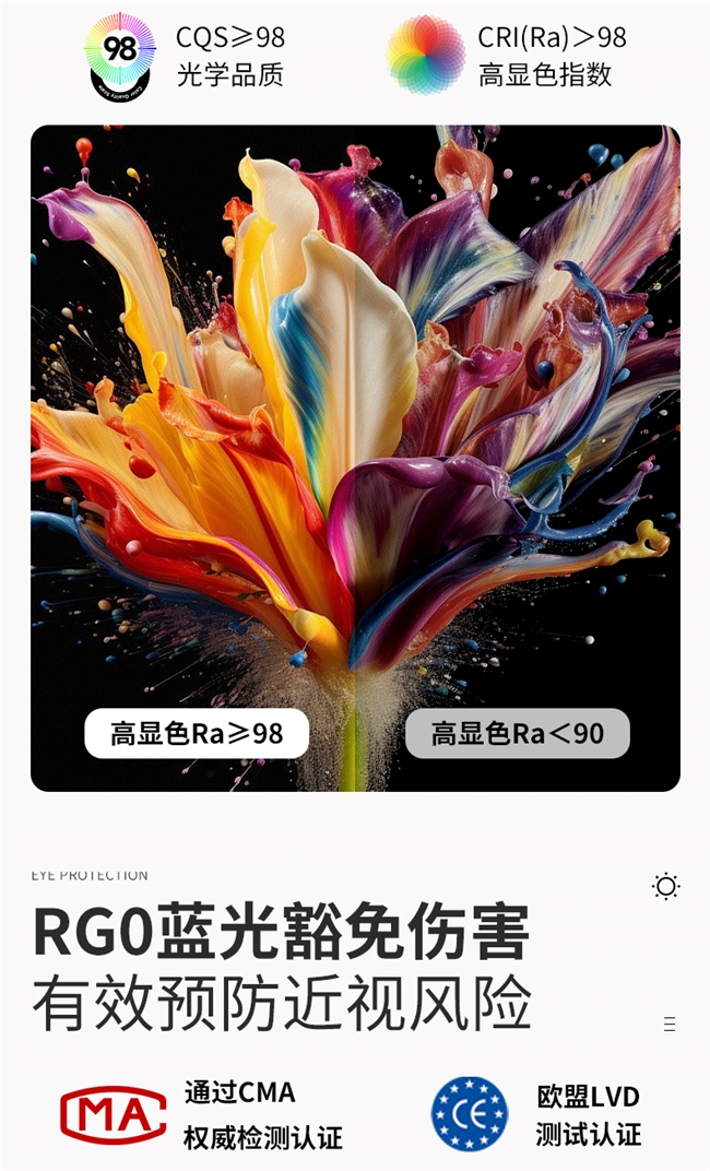 安全:RG0+IEEE国货安全最高标准。获得了RG0级蓝光豁免标准和**IEEEFPF≤0.05%**的无频闪认证,是国货在光生物安全上的最高承诺。