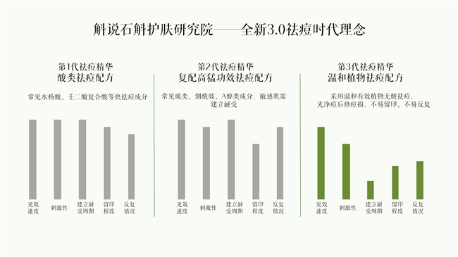 这标志着祛痘理念完成了清晰的代际升级。最初的祛痘1.0时代(强攻),其核心理念是快速镇压与强力剥脱,依赖单一高浓度酸类成分。消费者追求即时效果,但往往伴随刺激性大、易损伤屏障的显著痛点。