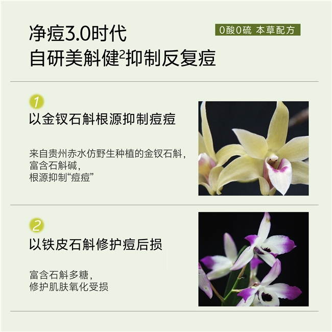 当前,市场正全面迈向祛痘3.0时代(智养)。其根本区别在于核心理念转变为“先净痘,后修护,边净边养”。代表成分也转向以金钗石斛、铁皮石斛等为核心的温和植物萃取复合体系。消费者的核心诉求明确为追求温和有效、不伤屏障。这一转变的背后,是现代年轻人“油痘敏”混合的复杂肌肤问题已成常态,同时护肤知识的普及让维护屏障健康的“长期主义”成为共识。