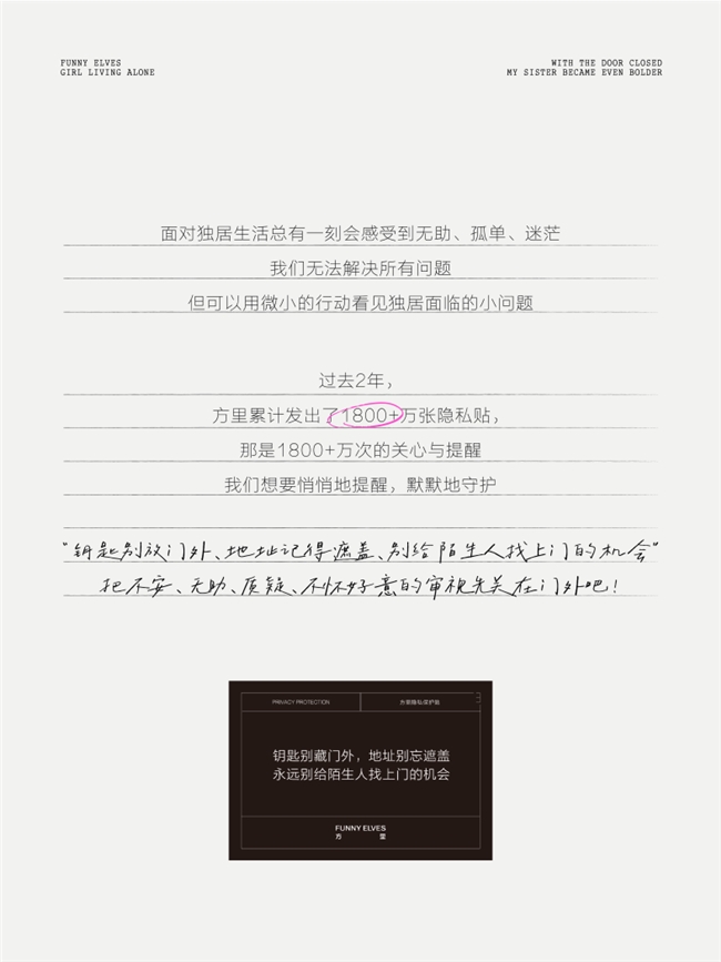过去两年,方里已累计发出1800+万隐私贴,那是1800+万的安全提醒,也是跨越经纬的陪伴与聆听。这张薄薄的贴纸,藏着Funny Elves方里对女性快递隐私的牵挂。