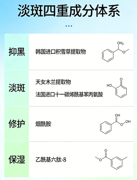 2. 成分安全高效:精选多国进口植萃与专利成分,无有害添加,敏肌、孕妇可用。天女木兰与十一碳烯酰基苯丙氨酸协同,靶向淡斑更精准,兼顾修护。
