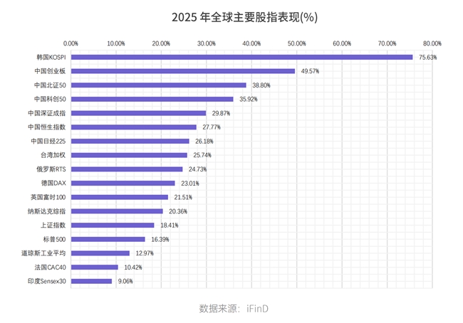 全球主要股指普遍收涨,区域分化加剧。韩国KOSPI以75.6%的涨幅领跑全球,亚太市场(如恒生指数、日经225)表现强劲。A股深证成指(+29.9%)、上证指数(+18.4%)跑赢美国道琼斯指数(+13.0%)。