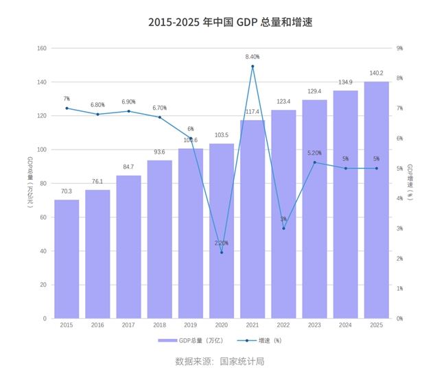 在中国,2025年GDP同比增长5.0%,总量突破140万亿元。消费对经济增长的贡献率(52%)超越投资,成为核心拉动力。第三产业贡献率(61.4%)巩固,以“其他行业”为代表的新兴服务业是核心增长极。