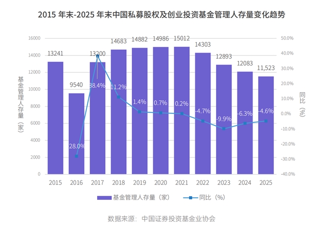 从一级市场来看,在募资端,管理人存量降至11,523家,同比减少4.6%,降幅收窄,行业“减量提质”趋势深化,格局基本定型。