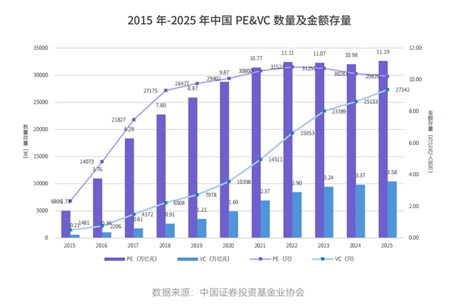 创业投资基金(VC)在数量和规模上保持强劲增长,私募股权基金(PE)进入高位盘整期。2025年新备案基金数量和规模实现反弹,市场信心修复。