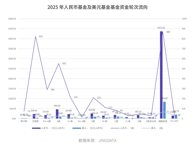 在轮次与资金结构上,中外资金偏好反差凸显。海外资金集中于后期轮次与战略投资;中国覆盖全轮次,早期轮次(天使轮)交易数量占优,战略投资金额领跑。人民币基金掌控基本盘(数量占优),美元基金通过“少而精”的大额下注重归市场。