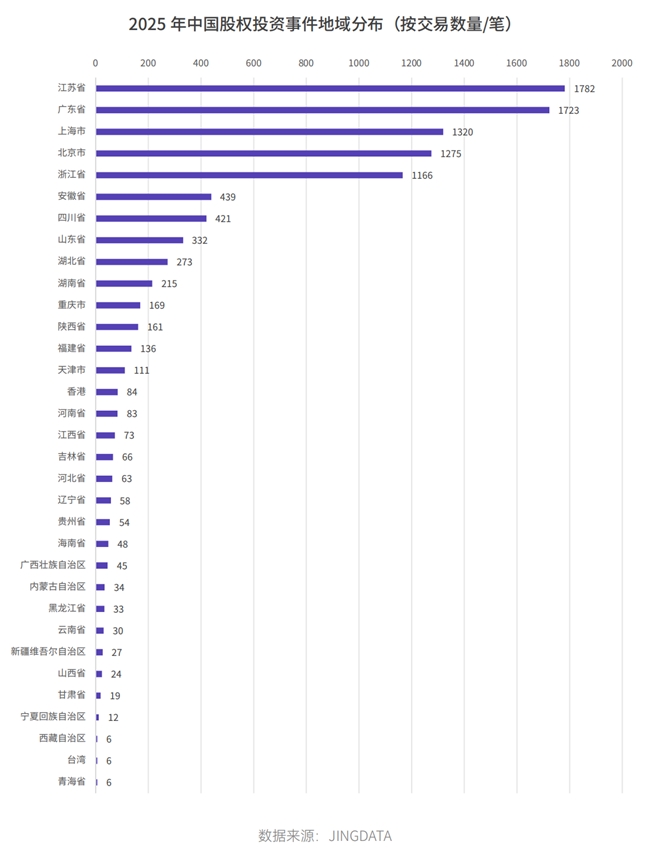 地域分布中,国际上形成中美双极引领格局(合计贡献全球超八成交易金额)。中国国内,东部沿海省市(江苏、广东、上海、北京、浙江)包揽超七成交易,江苏在交易数量上登顶,广东在交易金额上逆袭成为“最吸金”省份。