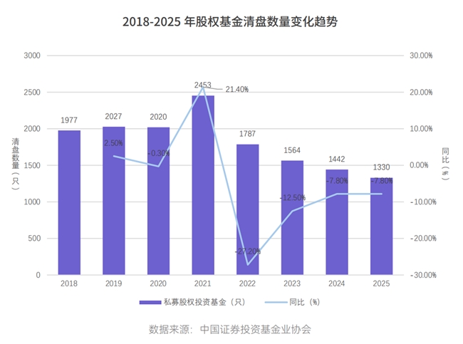 在退出端,私募股权基金清盘量连续下降,体现存量优化;创业投资基金清盘量持续增长,加速新陈代谢。